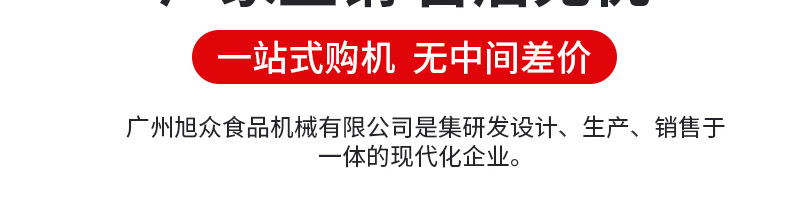 廣州旭眾食品機械有限公司是一家集科研開發(fā),生產(chǎn)設計,營銷服務為一體的現(xiàn)代化生產(chǎn)企業(yè)?,F(xiàn)代化生產(chǎn)車間,精湛制造技術,所產(chǎn)機械歷經(jīng)市場重重考驗,不斷贏得海內(nèi)外客戶的贊譽。