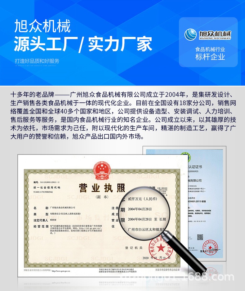 廣州旭眾食品機械有限公司是一家集科研開發(fā),生產設計,營銷服務為一體的現代化生產企業(yè)。現代化生產車間,精湛制造技術,所產機械歷經市場重重考驗,不斷贏得海內外客戶的贊譽。