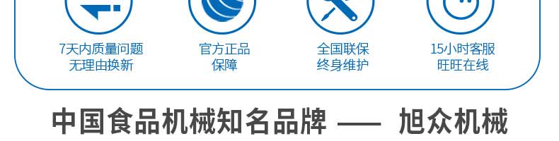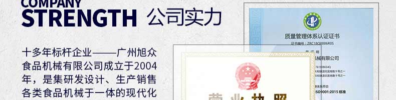 廣州旭眾食品機械有限公司是一家集科研開發(fā),生產(chǎn)設計,營銷服務為一體的現(xiàn)代化生產(chǎn)企業(yè)。現(xiàn)代化生產(chǎn)車間,精湛制造技術(shù),所產(chǎn)機械歷經(jīng)市場重重考驗,不斷贏得海內(nèi)外客戶的贊譽。