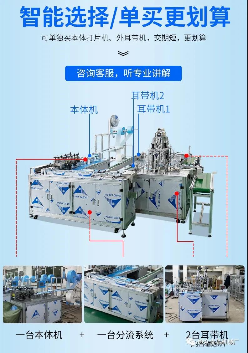 旭眾牌一拖二口罩機由一臺本體機帶動兩臺耳帶機組成。本體機輸出ロ罩本體后,由輸送帶結(jié)構將口罩本體片輸送到連接耳帶機的輸送帶上,再通過輸送帶將口罩片輸送到耳帶機的正面第一個口罩盤上方,最后通過氣缸下壓把口罩片放置到耳帶機的口罩盤內(nèi),后續(xù)由耳帶機完成口罩的耳帶熔接,包邊等動作,從而完成一個耳帶口罩產(chǎn)品的生產(chǎn)。本機采用PLC、觸摸屏控制、主傳送帶采用單相馬達輸送、步進馬達翻轉(zhuǎn),傳動精確,控制穩(wěn)定,速度可調(diào)。