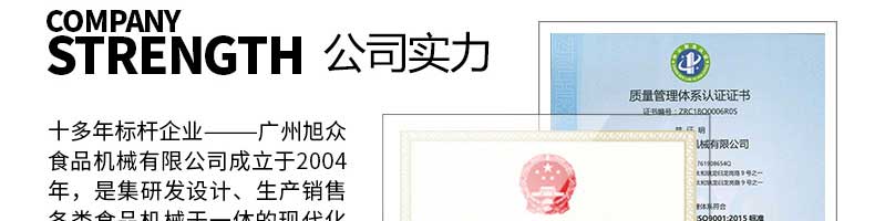 廣州旭眾食品機械有限公司是一家集科研開發(fā),生產(chǎn)設計,營銷服務為一體的現(xiàn)代化生產(chǎn)企業(yè)?,F(xiàn)代化生產(chǎn)車間,精湛制造技術,所產(chǎn)機械歷經(jīng)市場重重考驗,不斷贏得海內外客戶的贊譽。