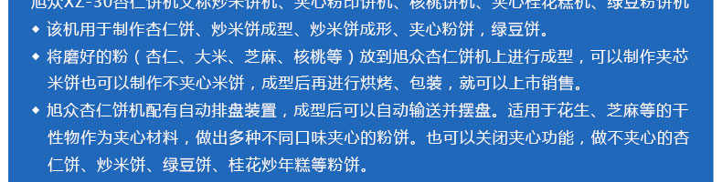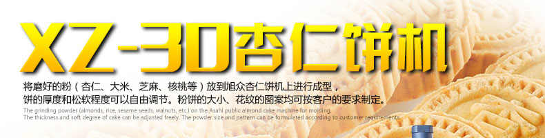 XZ-30杏仁餅機(jī),該機(jī)用于制作杏仁餅、炒米餅成型、炒米餅成形、夾心粉餅,綠豆餅。
