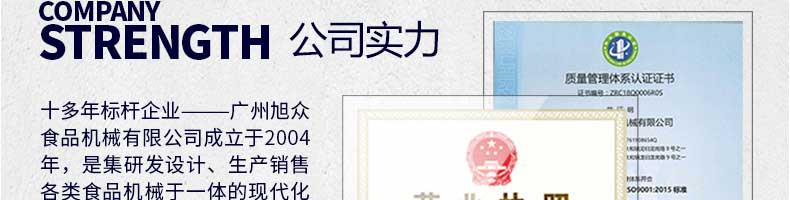 廣州旭眾食品機(jī)械有限公司是一家集科研開發(fā),生產(chǎn)設(shè)計(jì),營(yíng)銷服務(wù)為一體的現(xiàn)代化生產(chǎn)企業(yè)。現(xiàn)代化生產(chǎn)車間,精湛制造技術(shù),所產(chǎn)機(jī)械歷經(jīng)市場(chǎng)重重考驗(yàn),不斷贏得海內(nèi)外客戶的贊譽(yù)。