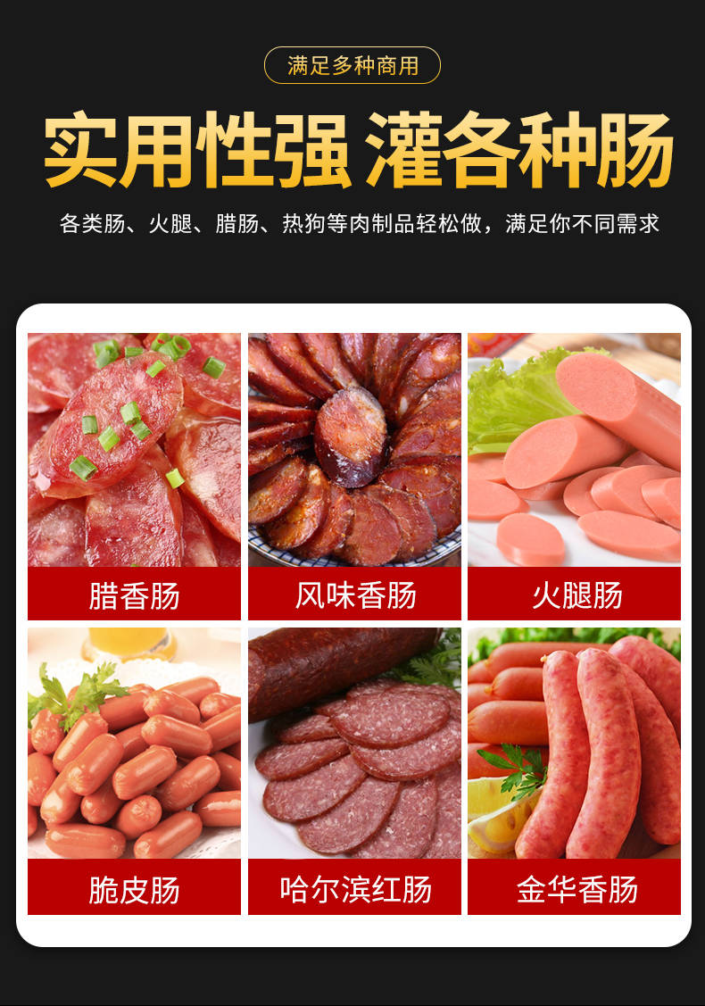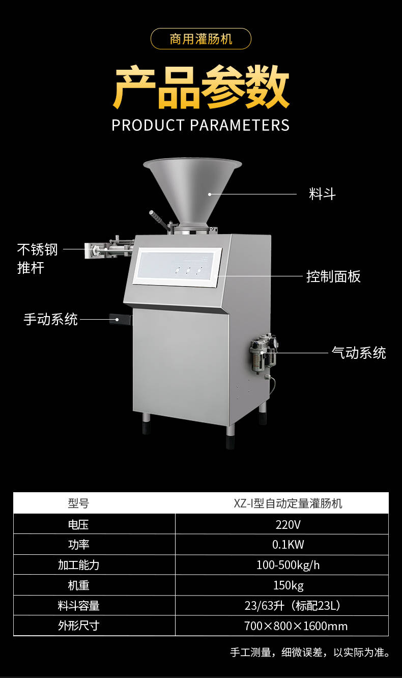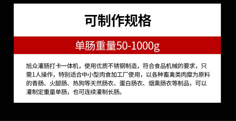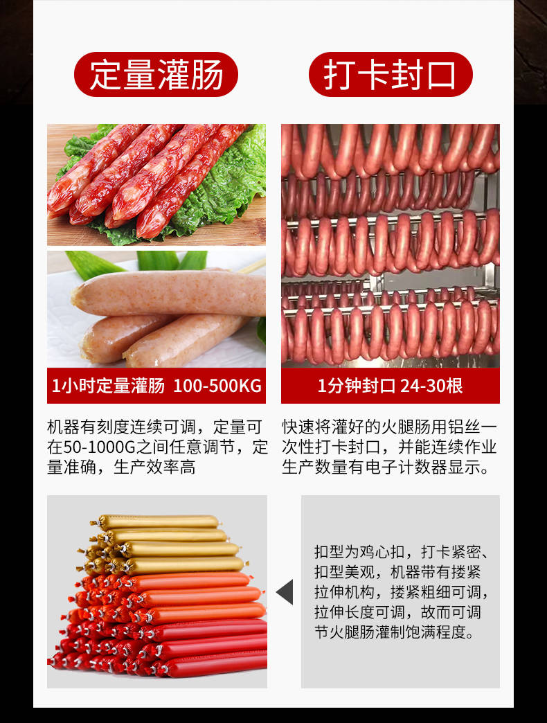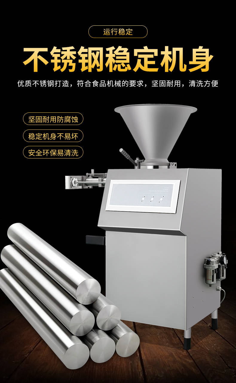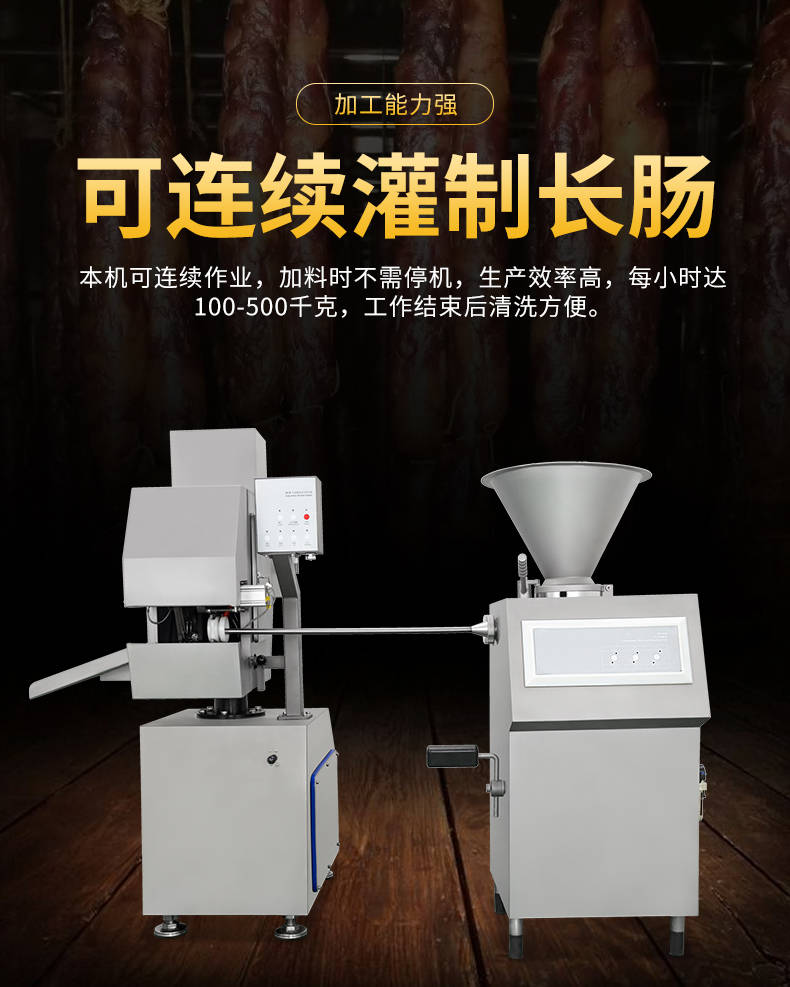 XZ-I型自動定量灌腸機,使用優(yōu)質(zhì)不銹鋼制造,符合食品機械的要求,只需1人操作,特別適合中小型肉食加工廠使用,以各種畜禽類肉糜為原料的香腸、火腿腸、熱狗等天然腸衣、蛋白腸衣、煙熏腸衣等制品,可以灌制定重量單腸,也可連續(xù)灌制長腸。