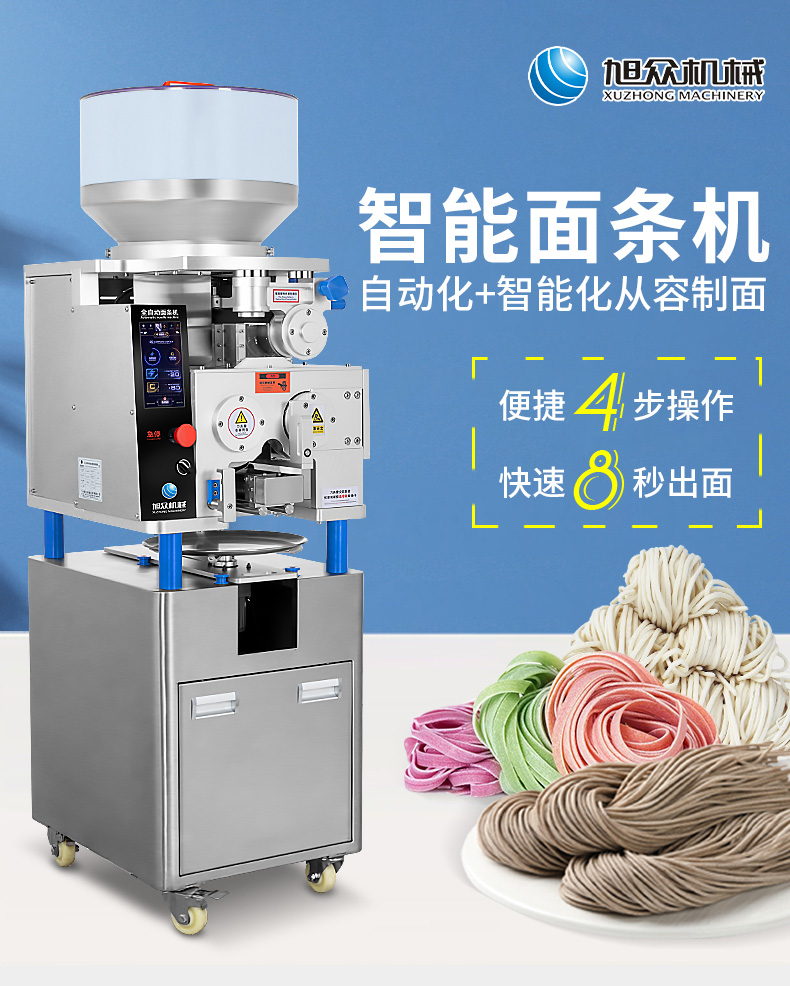 XZ-M800面條機(jī),制作多種面條:拉面、小面、牛肉面、韭葉面板面、褲帯面、蔬菜面、水果面、雜糧面8秒快速出面人性化設(shè)計,更便捷更高效與同類型機(jī)器相比,出面更快、秒換刀具。全不銹鋼刀組全不銹鋼可拆卸刀組,一秒更換防腐蝕抗氧化,清洗方便。
