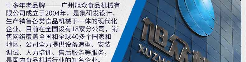 廣州旭眾食品機(jī)械有限公司是一家集科研開發(fā),生產(chǎn)設(shè)計(jì),營(yíng)銷服務(wù)為一體的現(xiàn)代化生產(chǎn)企業(yè)?,F(xiàn)代化生產(chǎn)車間,精湛制造技術(shù),所產(chǎn)機(jī)械歷經(jīng)市場(chǎng)重重考驗(yàn),不斷贏得海內(nèi)外客戶的贊譽(yù)。